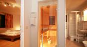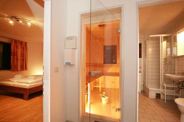 • V přízemí se nacházejí tři 2-lůžkové ložnice, vybavená kuchyně s prostorným jídelním koutem a LCD TV, 2x soc. zařízení (WC, umyvadlo, sprchový kout, fén na vlasy), sauna (zpoplatněna 1EUR/15minut) a dvě terasy. Nabízí komfortní ubytování až pro 6 osob. (B1)